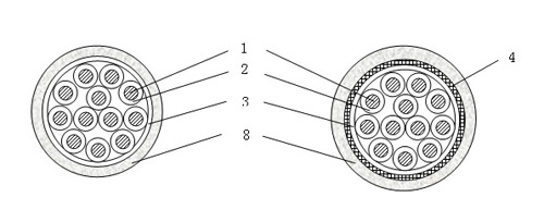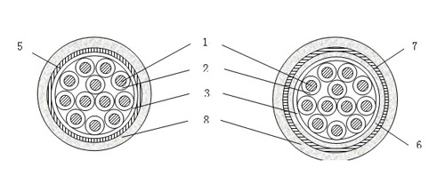 5--- 铜带屏蔽; 6--- 内护层; 7--- 钢带铠装; 8--- 聚烯烃护套。