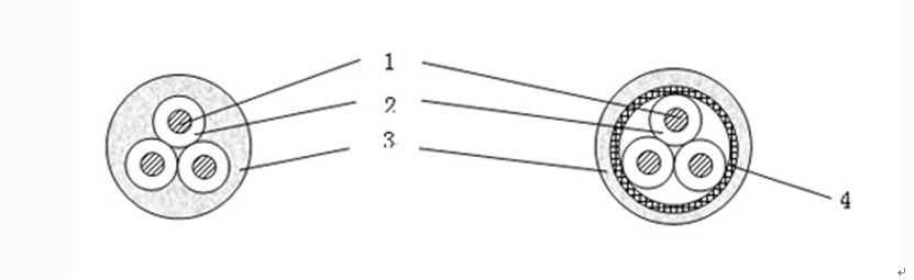 1--- 铜芯导体; 2--- 交联聚烯烃J缘; 3--- 聚烯烃护套; 4--- 铜丝编织屏蔽层。